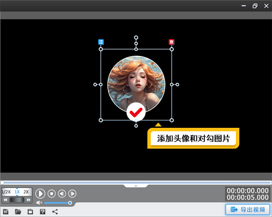 点击顶部“叠加素材”,在左侧栏选择“加贴图”。点击“添加贴图至列表”,导入你的头像和对勾图片,并调整它们的位置,使其居中显示。