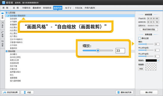 在爱剪辑中,点击界面上方的“画面风格”,在左栏选择“画面”。然后,给视频应用“自由缩放(画面裁剪)”功能。向右调整“缩放”滑块(正数表示放大画面),我们可以将画面放大,直到把黑边去除掉。这样,视频画面就变成了紧凑的4:3比例。