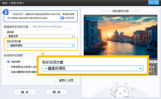 当你手中的视频饱和度较低,画面显得平淡无奇时,不妨在“色彩空间方案”的下拉框中选择“一键高级调色”。这一操作能够让视频色彩瞬间丰富多样起来,画面饱和度大幅提升,变得更加饱满,极大地增强了视频的吸引力,使其更能抓住观众的眼球。