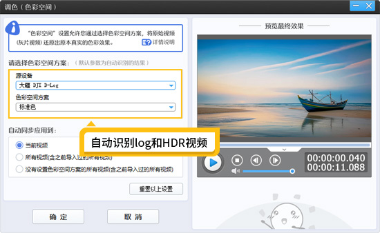 自动还原HDR和log灰片为高质量色彩:爱剪辑完美支持各大品牌的手机、相机、无人机、手持录像设备等硬件设备录制的“灰片”视频(log模式视频)和HDR视频,并进行高质量的色彩自动还原,以及为后期的剪辑调色或风格化创造更大的空间。